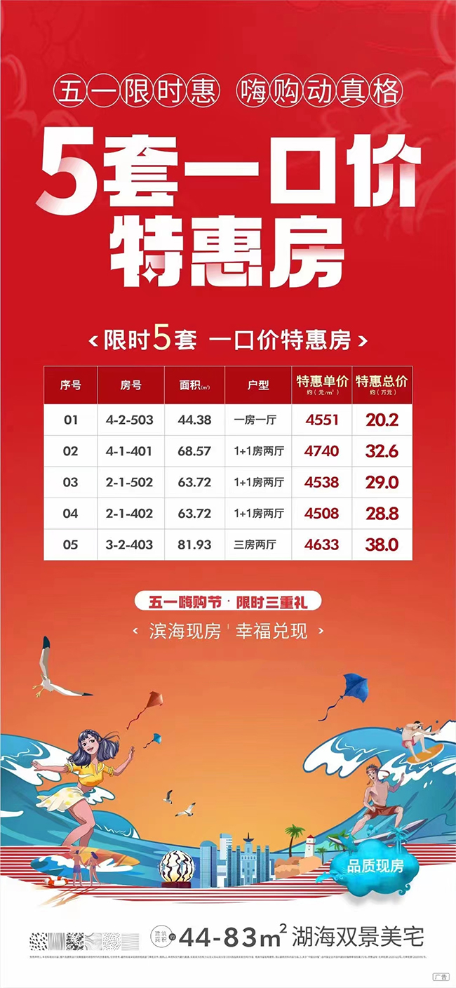 北海 北投观海湾 (户型 动态 相册)项目滨海准现房在售,户型建筑面积为44㎡-83㎡,整体均价4800元/㎡。现在月末特惠,推出10套特价房源,主力户型建筑面积为58㎡-82㎡,户型为一居到三居,特惠均价4600元/㎡。(活动时间:将于2022年6月3日截止)