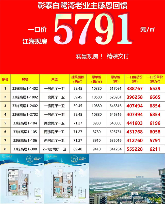 北海 彰泰白鹭湾( 户型 动态 相册 )项目新春特惠,共推出8套特惠房源,主力户型建筑面积为59㎡-89㎡的一房和两房,其中33栋高层1-106房,建筑面积为71.27㎡的两房,原价9810元/㎡,现在一口价5791元/㎡。其他房源特惠信息如下图,一房一价。(活动时间:即日起至2023年1月31日)