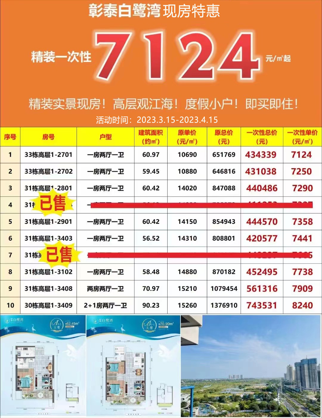 北海 彰泰白鹭湾( 户型 动态 相册 )在售精装实景现房,高层观江海的度假小户型,即买即住。精装一次性付款,均价7124元/㎡,10套特惠房源,已售2套,剩余8套,主力户型建筑面积为59㎡-90㎡的一房和两房,其中33栋高层1-2701房,建筑面积为60.97㎡的一房,原单价10690元/㎡,现在一口价7124元/㎡,总价43.4万/套。其他房源特惠信息如下图,一房一价。(活动时间:2023.3.15-2023.4.15)