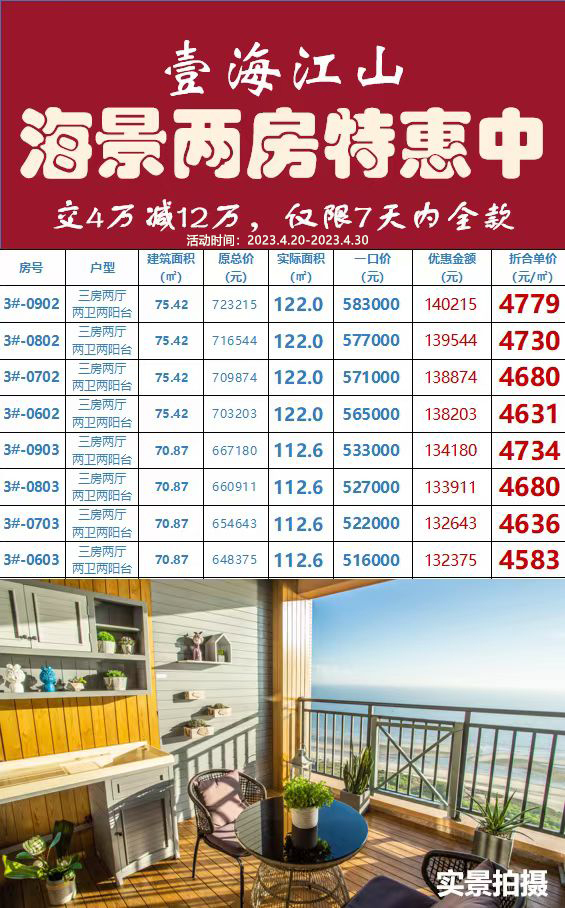 北海 和居壹海江山(户型 动态 相册)海景两房特惠中,8套特惠房源,交4万减12万,仅限7天内全款。海景准现房,亲海度假资产,2.4km海岸线。特惠楼栋3号楼,建筑面积75.42㎡、建筑面积70.87㎡,其中3栋0902号房,建筑面积75.42㎡三房,实得面积122㎡,原总价723215元,一口价583000元,优惠金额14万元,折合单价4779元/㎡。其他房源具体一房一价。(活动时间:2023.4.20-2023.4.30)具体时间以房源出售情况为准,售完即止。