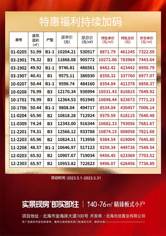 北海 铂悦湾( 户型 动态 相册 )特惠福利持续加码,15套精装现房特惠,一口价房源,实景现房,即买即住,板式小户,楼栋1#、3#、10#、11#、12#。户型建筑面积40㎡-76㎡。其中1栋0205房,建筑面积51.99㎡,原单价10204.21元/㎡,原总价530517元,特批单价8871.79元/㎡,总价461245元,折合单价7322元/㎡。其他房源特惠信息如下图,一房一价。(活动时间:2023.5.1-2023.5.31)