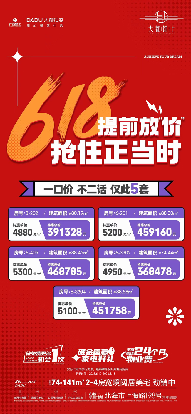 北海 大都锦上(户型 动态 相册)618提前放价,一口价房源仅5套。活动期间内购房可享免费更名机会1次,砸金蛋赢家电好礼,至高可享免24个月物业费。活动房源分布楼栋3#楼,6#楼,其中3-202号房,建筑面积80.19㎡,一口单价4888元/㎡,一口总价391328元;6-201户型建筑面积88.3㎡,一口单价5200元/㎡,一口总价459160元。另外,项目在售建筑面积74-141㎡2-4房阔景美宅。(活动时间:2023.6.10-2023.6.18)具体时间以房源出售情况为准,售完即止。