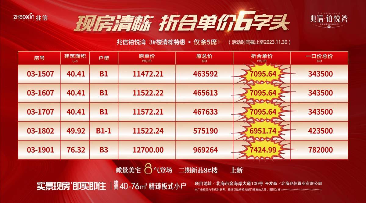 北海 铂悦湾( 户型 动态 相册 )3#号楼清栋特惠,仅5席,户型为建面40.41㎡1房;建面49㎡1+1房;建面76㎡2+1房,交房时间2026.12.30,2梯8户。其中03-1802号房,B1-1户型建筑面积49.92㎡,原单价11522.24元/平,原总价575190元,现特惠总价423500元,特惠单价6951.74元/平。其他房源一房一价。(活动时间截止至2023.11.30)。