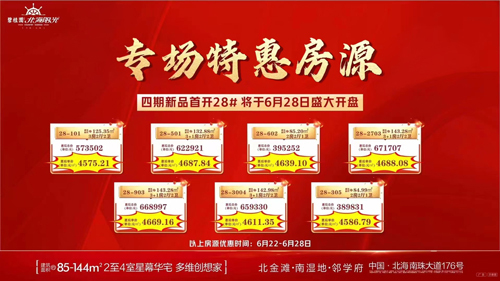 北海碧桂园北海阳光四期新品28#号楼首开,将于6月30日盛大开盘,7套特惠房源。建筑面积85-143平米2至4居。(活动时间:2023.6.22-2023.6.28) [详情]