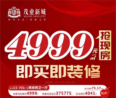 北海 茂业新城在售建筑面积49-93㎡实景现房,现有12套活动房源,分布在1#、12#、13#号楼,全包装修+品牌家电+高档家具,准现房。其中13-701房,建筑面积75.17㎡,两房两厅一卫,优惠总价375775元,优惠单价4999元/平,(活动时间:2023.7.10-2023.7.30) [详情]