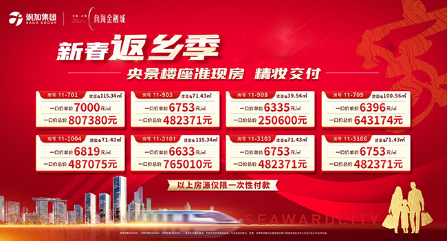 北海向海金融城新春返乡特惠,共推出8套一口价房源,户型建筑面积为39㎡-115㎡,其中11-908房,建筑面积为39.56㎡,现一口单价6335元/㎡,一口价250600太原。其他房源如下图,一房一价。(活动时间:即日起至2023年1月31日) [详情]