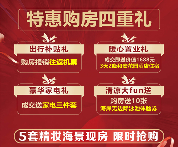 北海强盛城市海岸教师节,感念师恩,现房大特惠,购房享三重好礼。一重礼:5套纯一线精妆海景现房特惠一口价;二重礼:购房即享豪华家电大礼包三件套;三重礼:购房即享价值599元精美月饼礼盒1份。(活动时间截至2023.9.15) [详情]