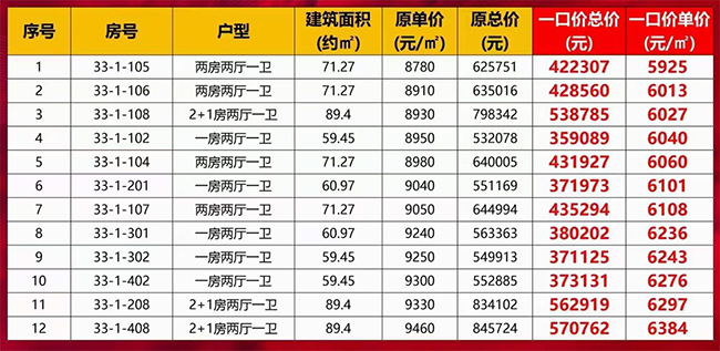 北海彰泰白鹭湾新春特惠,共推出8套特惠房源,主力户型建筑面积为59㎡-89㎡的一房和两房,其中33栋高层1-106房,建筑面积为71.27㎡的两房,原价9810元/㎡,现在一口价5791元/㎡。其他房源特惠信息如下图,一房一价。(活动时间:即日起至2023年1月31日) [详情]